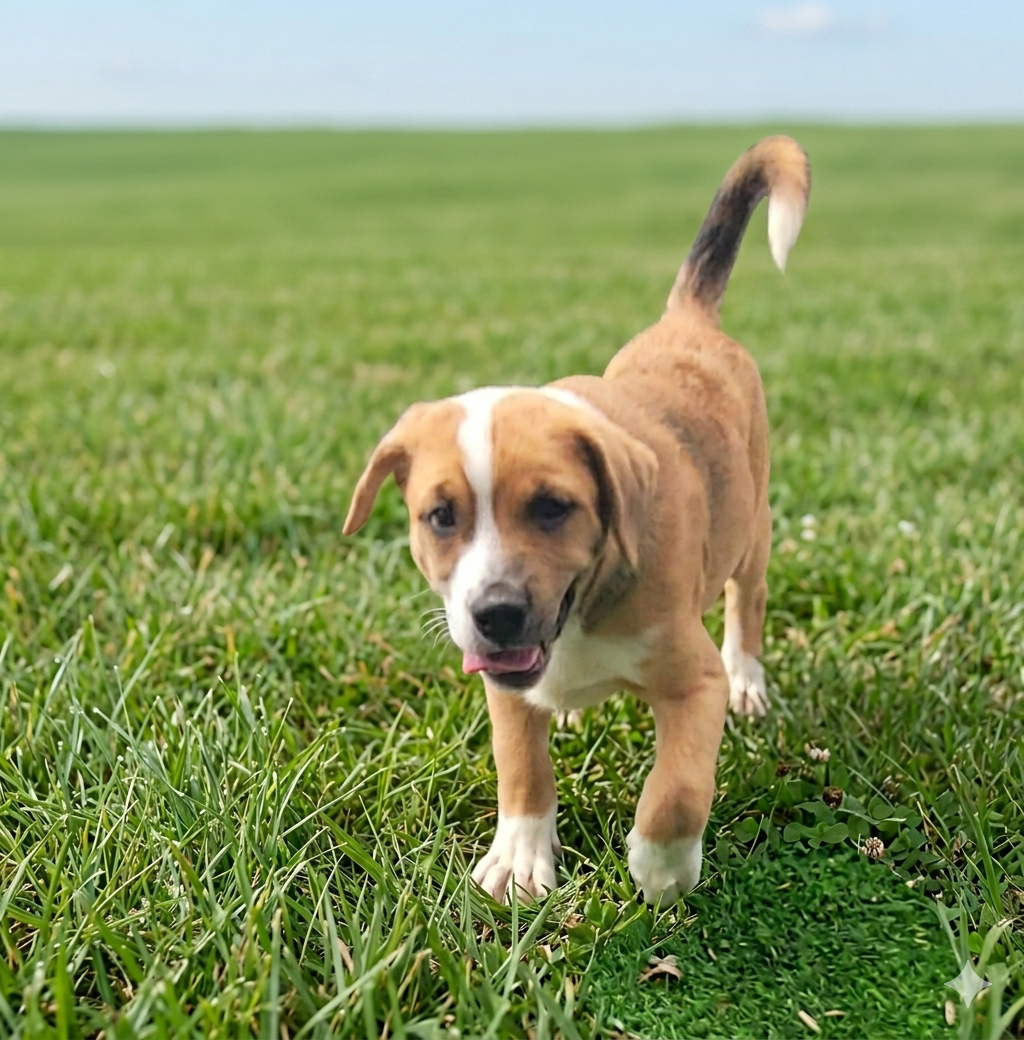 Koa has the sweet, friendly nature of her Beagle Hound heritage. She is a bundle of puppy love and is currently hitting all of her developmental milestones perfectly. She is the most rambunctious and playful of her litter—a fun-loving little engine!