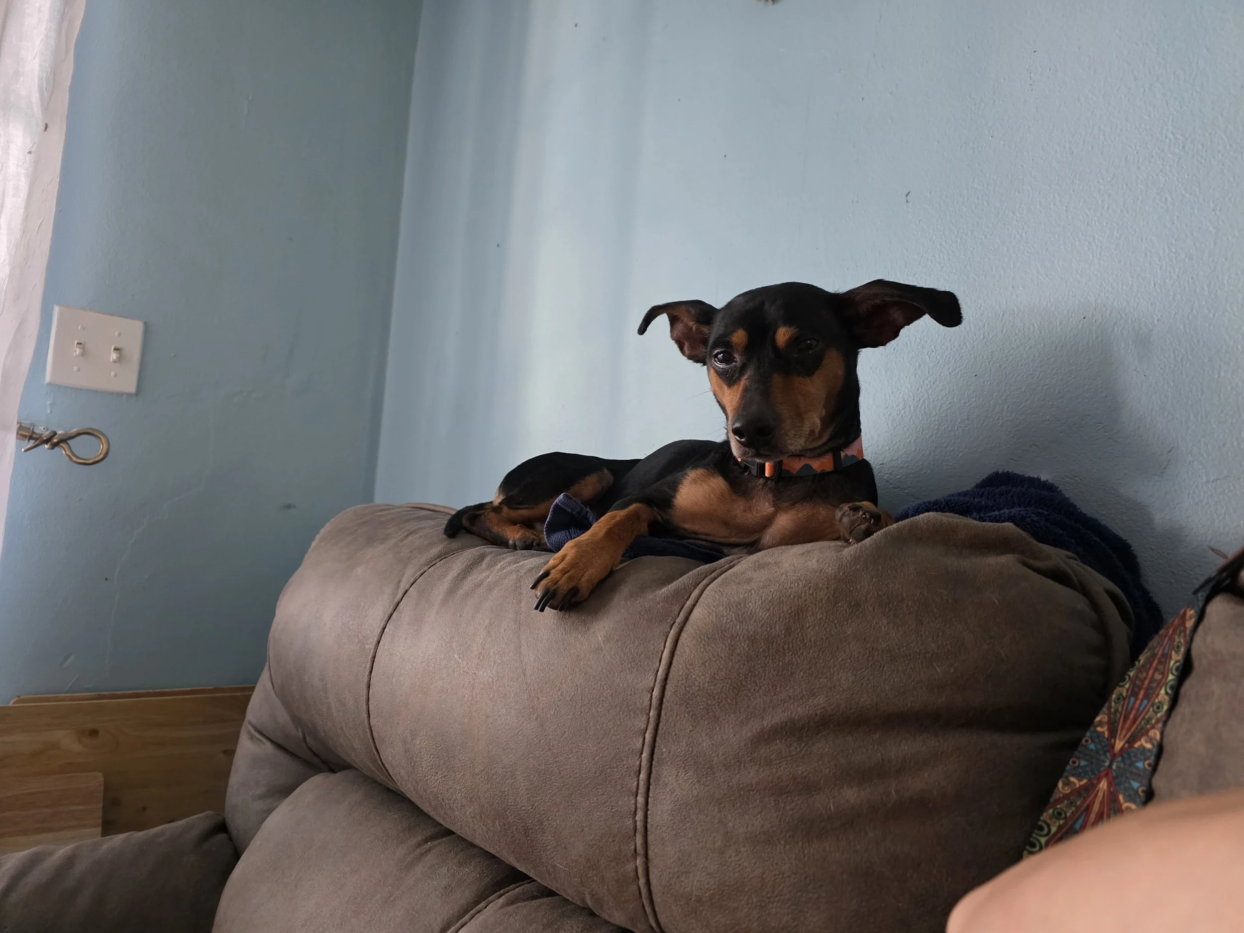 Affection Style: She isn't a "velcro" dog. She is happy to sit at your feet or on the couch nearby. When she wants affection, she will come to you!